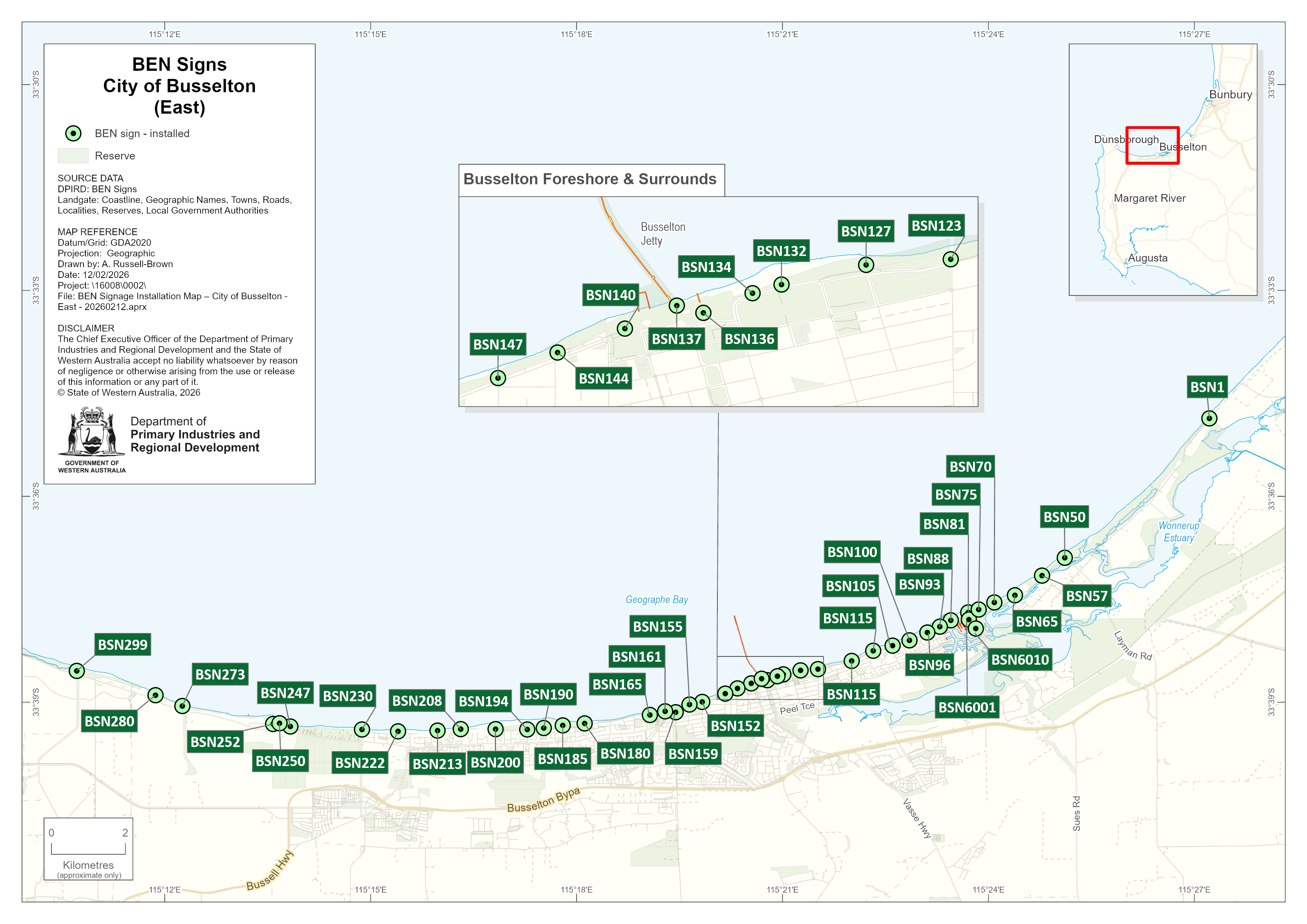 The maps below display BEN sign locations within the City of Busselton.
