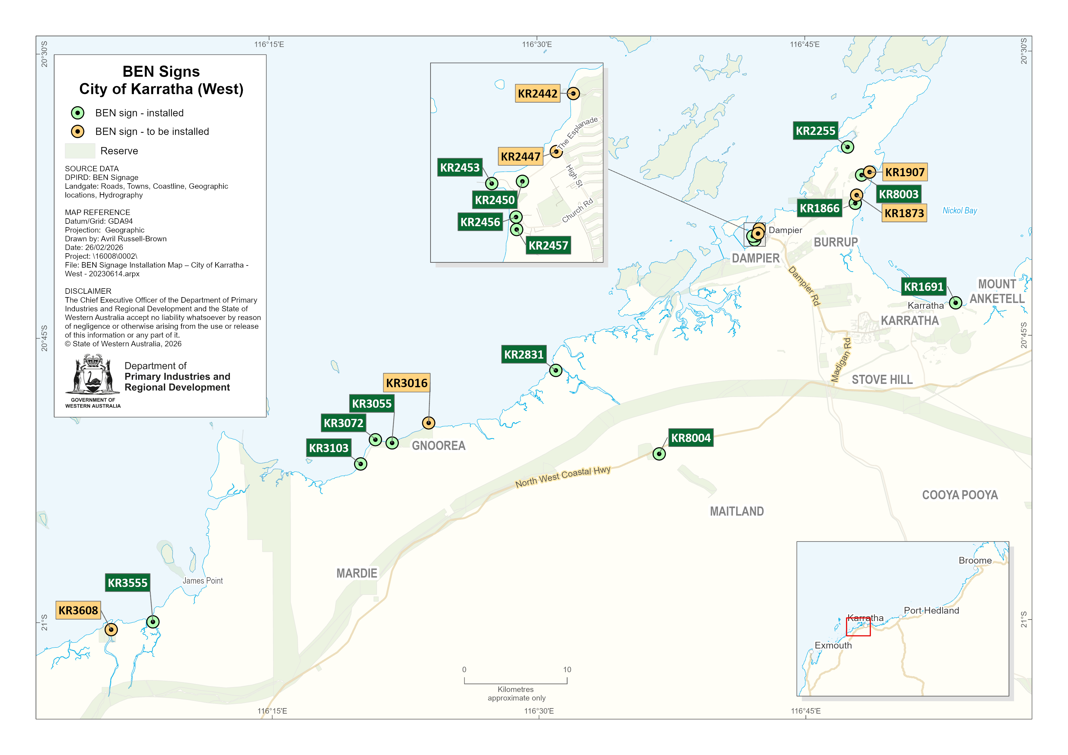 The maps below display BEN sign locations within the City of Karratha.